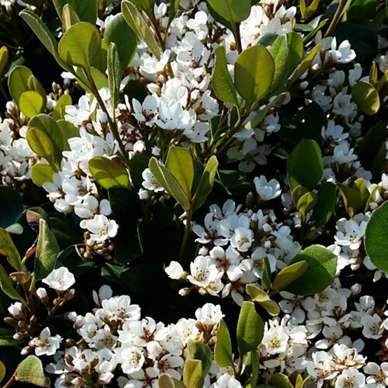Extended Features: Raphiolepis Indica 'Conia', also known as Indian Hawthorn Olivia™, this beautiful small evergreen shrub has clusters of white flowers in early summer. Vigorous growth with excellent branching to create a full uniform shrub. Sun to part shade. FEATURES: Botanical Name: Raphiolepis Indica 'Conia' PP#9399 Common Name: Indian Hawthorn Olivia™ Features: Foliage Interest, Mounded Habit, Low Maintenance Bloom Time: Spring - Fall Light Requirements: Full Sun -Partial Sun Attracts Birds Resists Deer, Resists Disease Mature Plant Size: 5 feet Zone 7 - 11