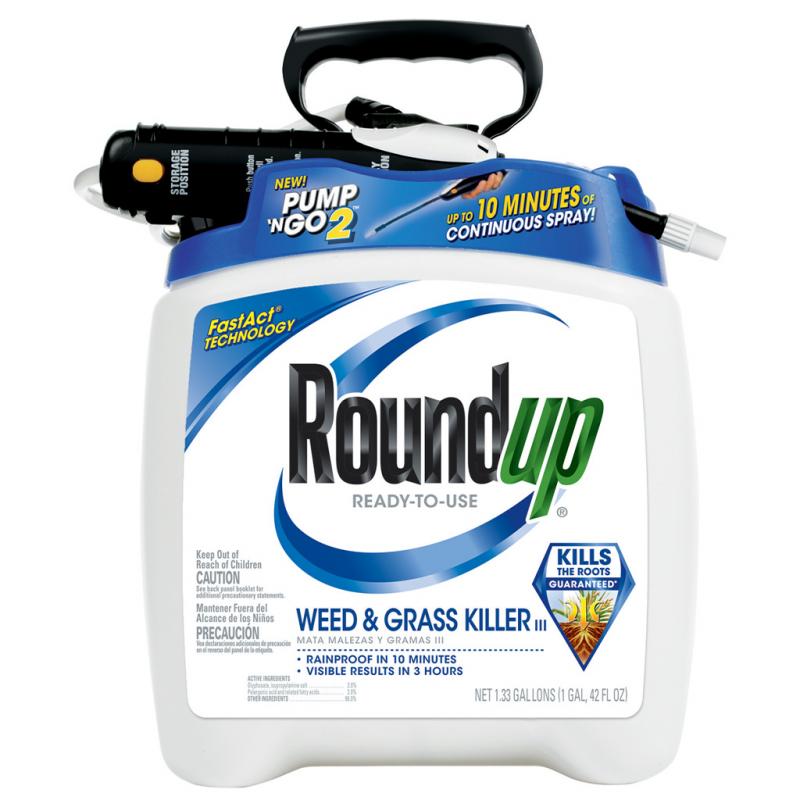 | 1.33 GAL PUMP & GO SPRAYER Round-up Weed and Grass Killer Ready to Use Plus. Available in large size RTU. Pre-measured, pre-mixed, easy to use. Gallon container treats more than 1,000 weeds. Effective in cool and cloudy conditions as well as warm and sunny. Replant one day after application. Foaming technology lets you see where you spray. |