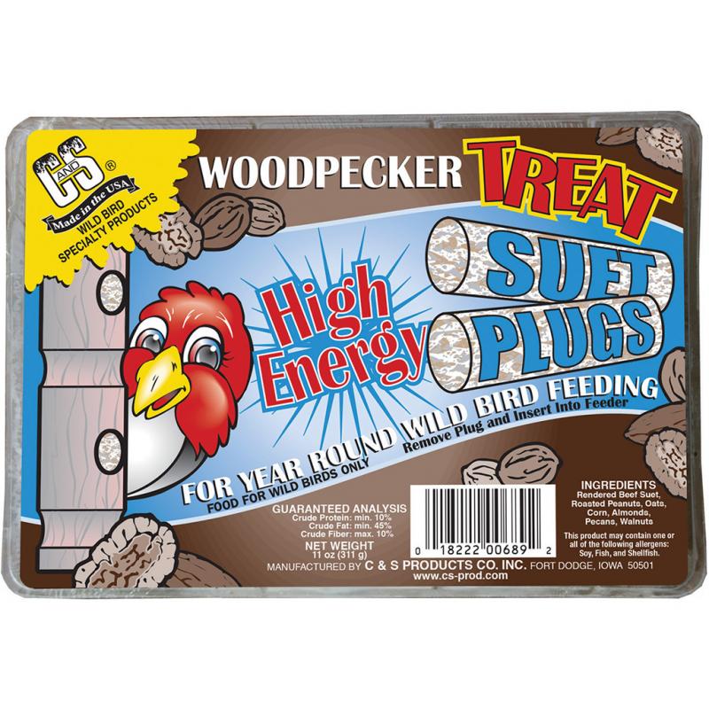 Rendered beef suet, roasted peanuts, oats, corn, almonds, pecans, and walnuts. Designed for use in a Suet Plug Feeder. They are the most convenient and easiest way to attract woodpeckers.