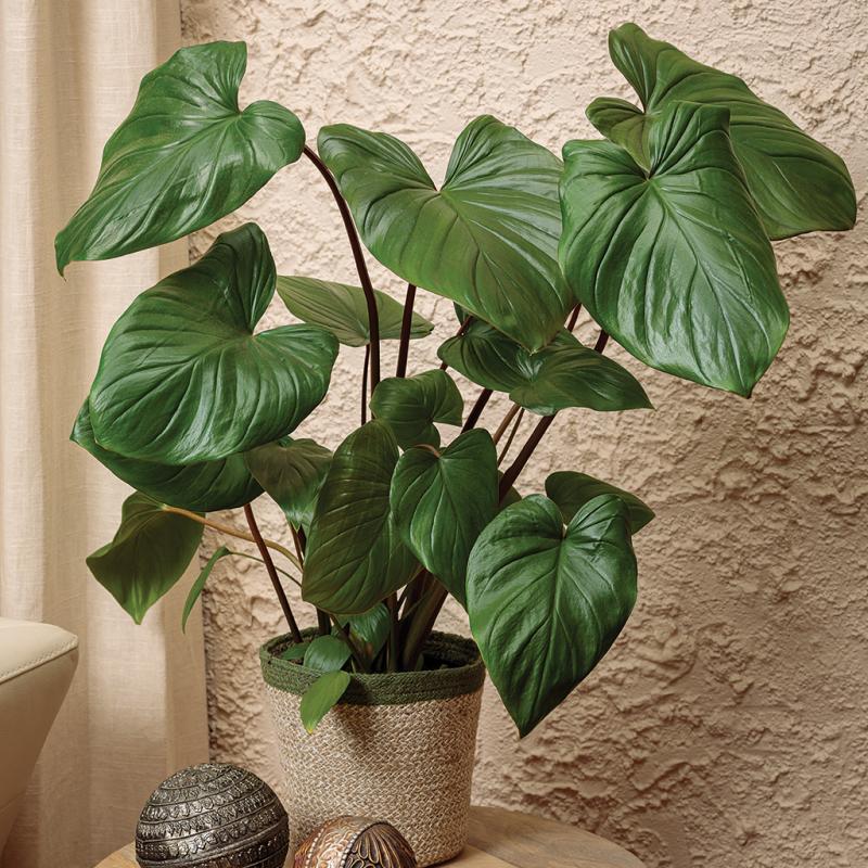 Extended Features: Homalomena 'Maggy' is a stunning plant in the Aroid plant family with large, heart-shaped leaves and beautiful, orangey-pink petioles. It is a very easy care plant for lower-light locations in your home. Other common names include 'Shield Plant'.