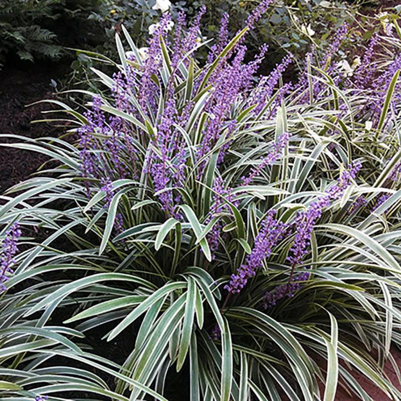 | Liriope muscari 'Variegata', also known as Lilyturf or Blue Lily turf, this tuffted grass-like perennial typically grows 12 - 18 inches tall and features strap-like arching, glossy, dark green leaves. Very showy in mass. Purple summer flowers are followed by black berries. Slower grower than the green leaf varieties. Sun to shade. FEATURES: Botanical Name: Liriope muscari 'Variegata' Common Name: Lilyturf Variegated Features: Low Maintenance Bloom Time: Summer Light Requirements: Full Sun -Partial Sun Resists Deer, Rabbits Mature Plant Size: 12 inches Zone 6 - 11 | |