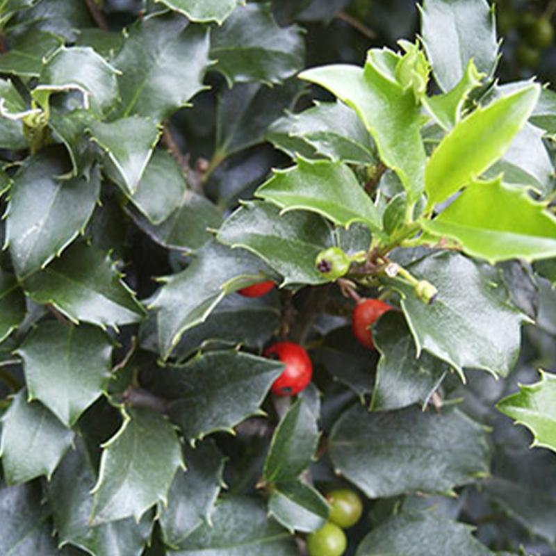 | • Grows 4’ to 5’ tall • Medium fast growing Holly. Blue-green leaves. Male and female. Red berries | |
