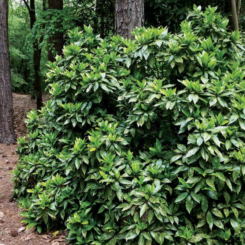 | Aucuba japonica 'Variegata', also known as Gold Dust or spotted laurel, this gorgeous evergreen is a shade lover that shows wonderful foliage color all year long. Although they can tolerate some sun, their foliage color shows best when in a mostly shady area. These elegant plants can be used as a foundation plant or in a special spot as a specimen. Variegated Aucuba is a compact evergreen shrub with large glossy dark green leaves heavily sprinkled with yellow spots. Moderately salt tolerant in well drained soils. FEATURES: Botanical Name: Aucuba japonica 'Variegata' Common Name: Gold Dust Plant Features: Drought Tolerant, Evergreen, Salt Tolerant, Winter Interest, Rounded Habit Bloom Time: Grown for Foliage Light Requirements: Full Shade -Partial Shade Mature Plant Size: 6 - 10 feet Zone 6 - 10 | |
