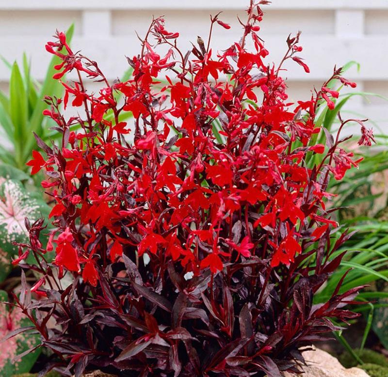 Extended Features: Lobelia cardinalis 'Queen Victoria', also known as Cardinal Flower, this annual has outstanding maroon foliage adorned with bright scarlet flower spikes reaching 5 feet in height. Prefers partial shade and very moist soil such as low wooded areas. Can be grown in full sun in cooler climates. FEATURES: Botanical Name: Lobelia cardinalis 'Queen Victoria' Common Name: Cardinal Flower Queen Victoria Features: Mounding Habit, Heat Tolerant, Native to North America Bloom Time: Summer - Fall Light Requirements: Full Sun -Partial Shade Attracts Butterflies, Hummingbirds Resists Deer, Rabbits Mature Plant Size: 24 - 36 inches Zone 5 - 9