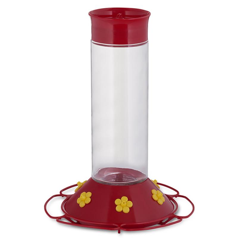 All glass 30 oz feeding bottle with six flower feeding stations. Standard vacuum design, but guaranteed not to drip in direct sunlight. Comes with a detachable full circle perch.
