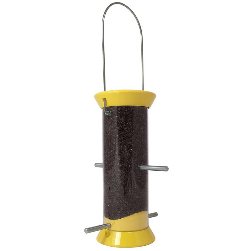 Extended Features: Sturdy metal parts and long lasting UV-stabilized polycarbonate tubes. Durable powder coating. Zinc die-cast tops, bases and ports last a lifetime. Stainless steel wire - squirrels can’t chew. Snug fitting sliding cap - easy for you to lift but hard for squirrels. Top easily removes for easy cleaning. Seeds flow freely over internal seed baffle. Threaded base allows for use with Droll Yankees accessories. Lifetime warranty against squirrel damage. Made in the U.S.A.