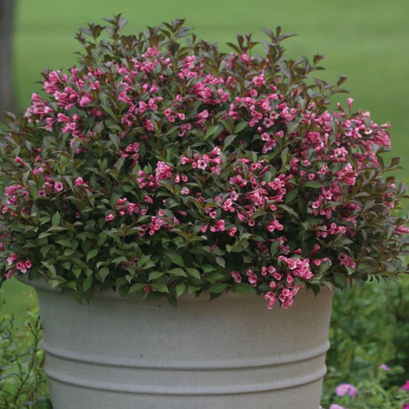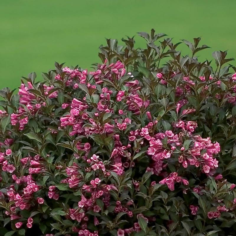 | Weigela florida 'Bramwell', also known as Fine Wine®, this shrub has pink trumpet shaped blooms on dark burgundy foliage. Maintains a compact, mounded habit is resistant to deer. This Proven Winner® makes a great foundation plant in any sunny location. FEATURES: Botanical Name: Weigela florida 'Bramwell' PP18,513 Common Name: Weigela Fine Wine® Features: Compact, Low Maintenance, Grown for Foliage, Mounding Habit Bloom Time: Spring - Summer Light Requirements: Full Sun Attracts Butterflies, Hummingbirds Resists Deer Mature Plant Size: 24 - 36 inches high by 24 - 36 inches wide Zone 4 - 8 Proven Winners® | |