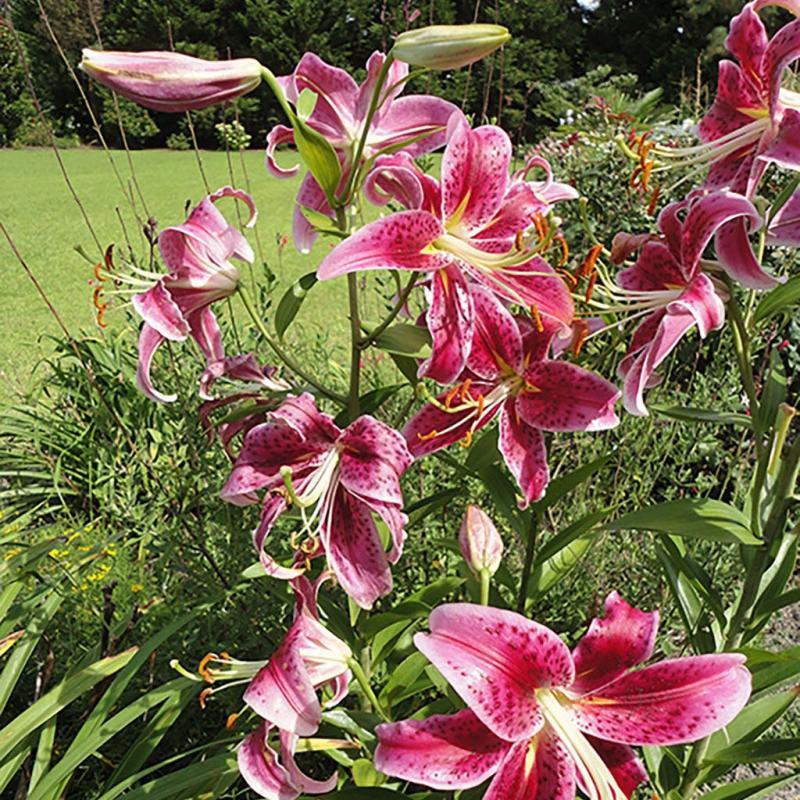 | Lilium 'Stargazer', also known as Oriental Lily, this heavenly fragrant fragrant perennial has bright crimson-pink flowers with dark spots with white edges. Blooms in the mid-late summer, this Lily makes a great cut flower, border plant, or in a container. This Lily performs best with planted in full sun and well drained soils with good moisture. Please note, this plant may be toxic to cats. FEATURES: Botanical Name: Lilium 'Stargazer' Common Name: Oriental Lily Stargazer Features: Fragrant Flower, Great Cut Flowers Bloom Time: Summer Light Requirements: Full Sun -Partial Shade Attracts Butterflies, Hummingbirds Resists Deer, Rabbits Mature Plant Size: 24 - 30 inches Zone 4 - 9 | |