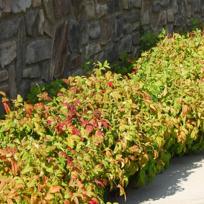 | The best low growing Nandina. Non spreading variety. 2' tall by 2' wide. Broadleaf Foliage is green and changing to brilliant red by Fall. White flowers in spring, red berries in winter. | |
