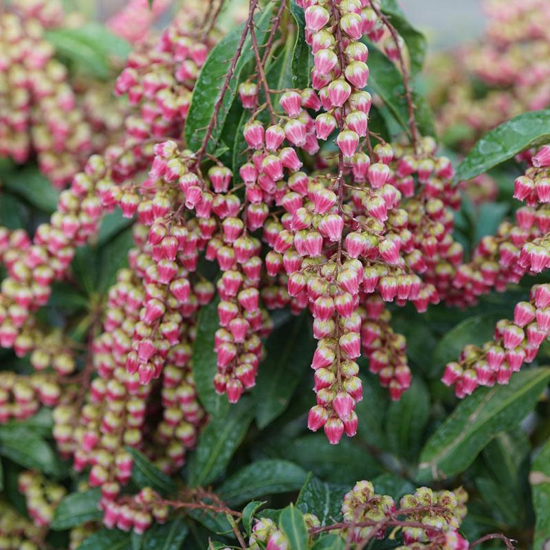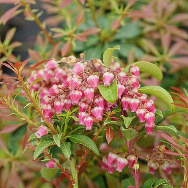 Extended Features: Interstella pieris (or Lily of the valley shrub) is one of the earliest blooming plants, starting its display of beautiful, bell-like, ruby-colored flowers before the calendar even say its spring. And there are hundreds of them, dangling delicately from fine stems against a gorgeous evergreen backdrop. The flowers persist for a very long time - two months or more, often - and when they are done, the plant begins a dazzling display of star-like bright red new growth. This is possibly the most shade tolerant flowering shrub, blooming well even in very low light conditions, and it's deer resistant, too. FEATURES: Botanical Name: Pieris jap. Interstella® PPAF Common Name: Lily of the Valley Shrub Interstella® Features: Evergreen, Winter Interest Bloom Time: Spring Light Requirements: Partial Sun -Full Shade Attracts Bees Resists Deer Mature Plant Size: 4 feet high by 4 feet wide Zone 5 - 8 Proven Winners®