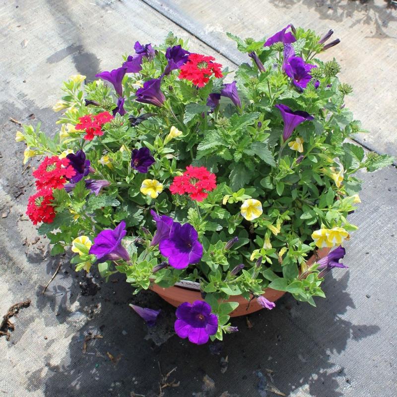 | Wonderful mix of Angelonia Angelface® Cascade Blue, Verbena Superbena® Red and Verbena Superbena® Whiteout™ in a 12 inch bowl or a 12 inch hanging basket! FEATURES: Common Name: American Rhythm Light Requirements: Full Sun Proven Winners® | |