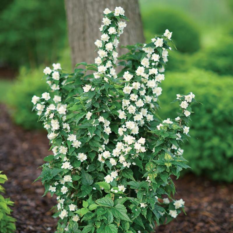 | Philadelphus coronarius Illuminati Tiny Tower™, also known as Mock-Orange, has a narrow, columnar habit and unique four-sided "tower" effect. Early summer brings hundreds of fragrant white flowers along the dramatically upright branches, each nestled within handsome dark green foliage. FEATURES: Botanical Name: Philadelphus coronarius 'SMNPVG' PPAF Common Name: Mock-Orange Illuminati Tiny Tower™ Features: Drought Tolerant, Fragrant, Upright Habit Bloom Time: Spring - Summer Light Requirements: Full Sun Attracts Butterflies, Hummingbirds, Bees Resists Deer Mature Plant Size: 3 - 4 feet Zone 4 - 7 Proven Winners® | |