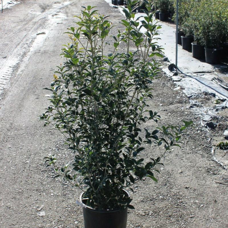 | Osmanthus x fortunei, also known as Tea Olive or False Holly, this upright and mounding shrub features leathery dark green leaves with triangular teeth on each side of the small spine. Plus, this shrub boasts fragrant white flowers in late fall. Great to use as a hedge or screen. Sun to part shade. FEATURES: Botanical Name: Osmanthus x fortunei Common Name: Fortune's Tea Olive Features: Evergreen, Fragrant Flower, Drought Tolerant, Salt Tolerant Bloom Time: Fall Light Requirements: Full Sun -Partial Sun Resists Deer Mature Plant Size: 6 - 8 feet Zone 7b - 11 | |