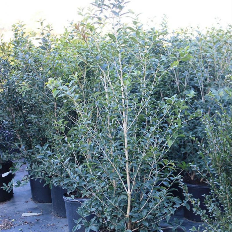 | Osmanthus x fortunei, also known as Tea Olive or False Holly, this upright and mounding shrub features leathery dark green leaves with triangular teeth on each side of the small spine. Plus, this shrub boasts fragrant white flowers in late fall. Great to use as a hedge or screen. Sun to part shade. FEATURES: Botanical Name: Osmanthus x fortunei Common Name: Fortune's Tea Olive Features: Evergreen, Fragrant Flower, Drought Tolerant, Salt Tolerant Bloom Time: Fall Light Requirements: Full Sun -Partial Sun Resists Deer Mature Plant Size: 6 - 8 feet Zone 7b - 11 | |
