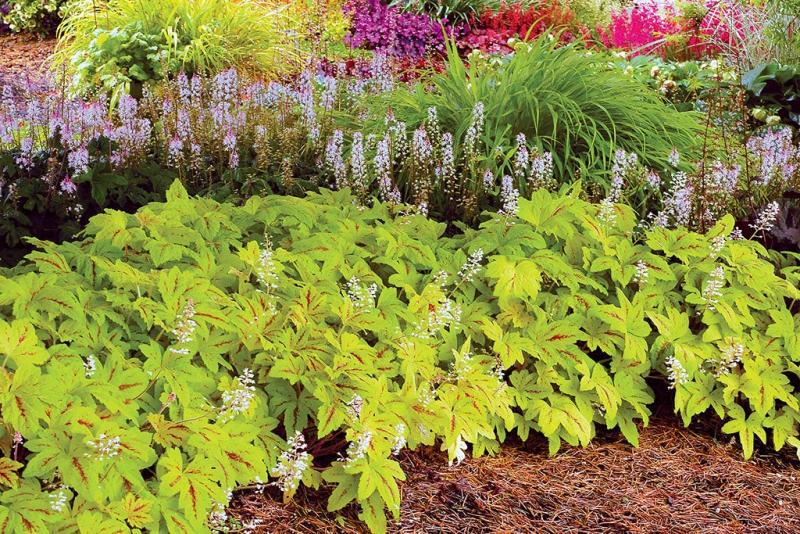 | Heucherella Fun Games® 'Eye Spy', also known as Foamy Bells, this easy-to-grow and long blooming perennial is prized for it's attractive foliage and bubblegum pink flowers. Amber yellow spring foliage has deep rose centers and fades to chartreuse green with a silver overlay. Performs best in part shade but grows in sun or shade. FEATURES: Botanical Name: Heucherella Fun Games® 'Eye Spy' PPAF Common Name: Foamy Bells Fun and Games® Eye Spy Features: Winter Interest, Foliage Interest, Mounded Habit Bloom Time: Spring - Fall Light Requirements: Full Shade -Partial Shade Attracts Bees Mature Plant Size: 8 - 10 inches Zone 4 - 9 Proven Winners® | |