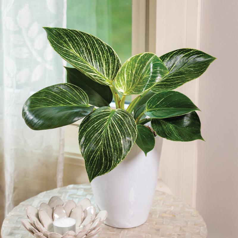 | Birkin is a striking, non-climbing Philodendron that has white pinstripes on its green foliage. The plant grows more and more variegated as it matures. The variegation is always a surprise. Each leaf is unique! | |