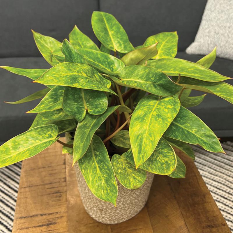 Extended Features: This stunning Philodendron has mottled yellow-green, chartreuse leaves and contrasting pink petioles. It is a climber, so be sure to give it a support such as a moss pole or trellis. Leaves will get bigger and bigger when given a support!